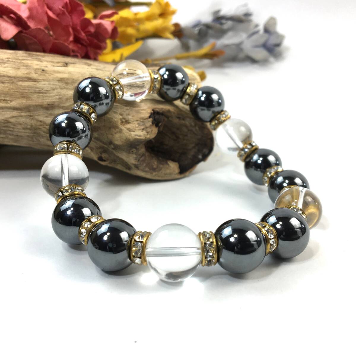- ヘマタイト&水晶 パワーストーン ブレスレット 天然石ブレス (ゴールド) 12mm 幸運 開運 メンズ 男性♪