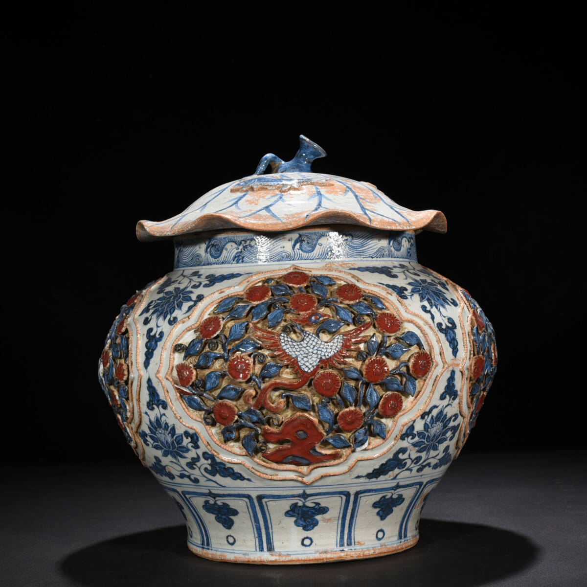 - ◆珍蔵◆中国古美術 元代 元青花 釉里紅 捏花 古陶磁 鹿鳳紋荷叶罐 細密細工造 置物 擺件 骨董品 古賞物 時代物 A33