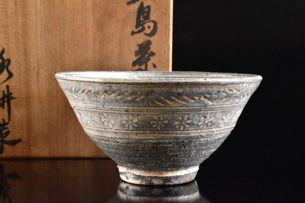 > 【雲】某名家買取品 瀬戸 灰釉 花彫刻三島茶碗 在銘 共箱 古美術品(茶道具) F8341