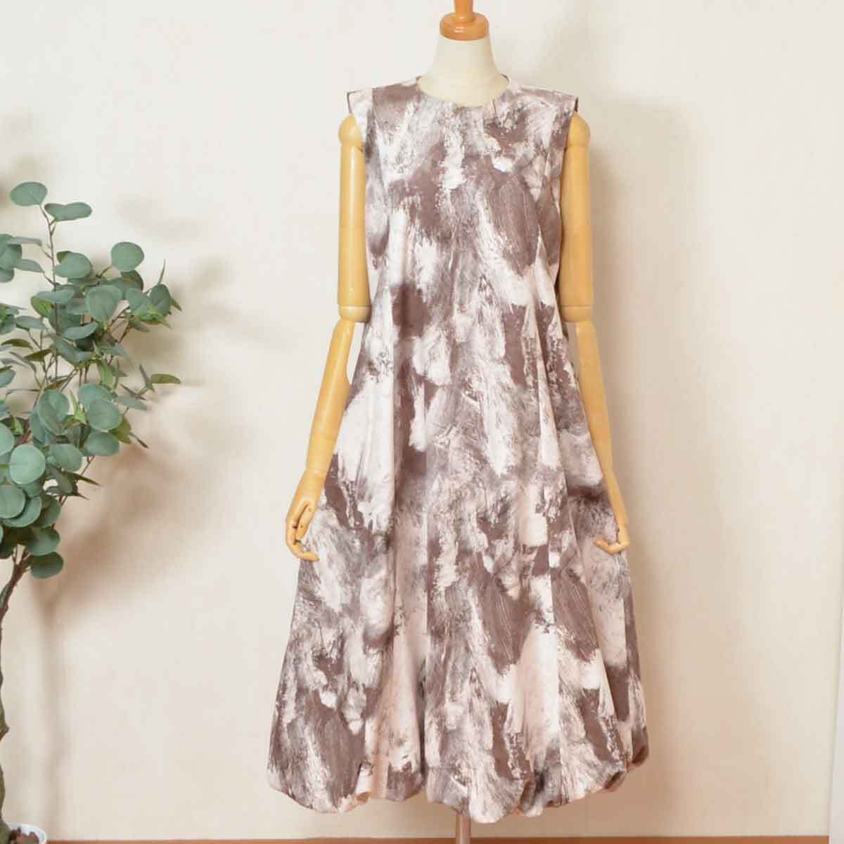 > 総柄バルーンワンピース C-3197 SILENT WORTH ジャカード起毛素材 体型カバー 秋冬 ノースリーブ アイボリー系