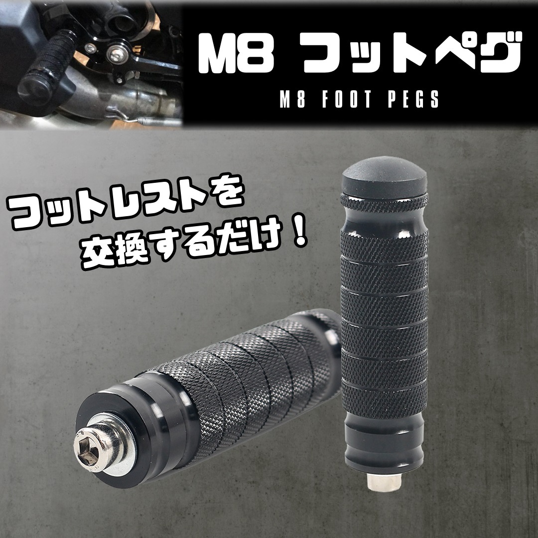 - M8 フット ペグ レスト ペダル ステップ バー バイク オートバイ パーツ 汎用 滑り 防止 ローレット 2本 セット アルミ ブラック