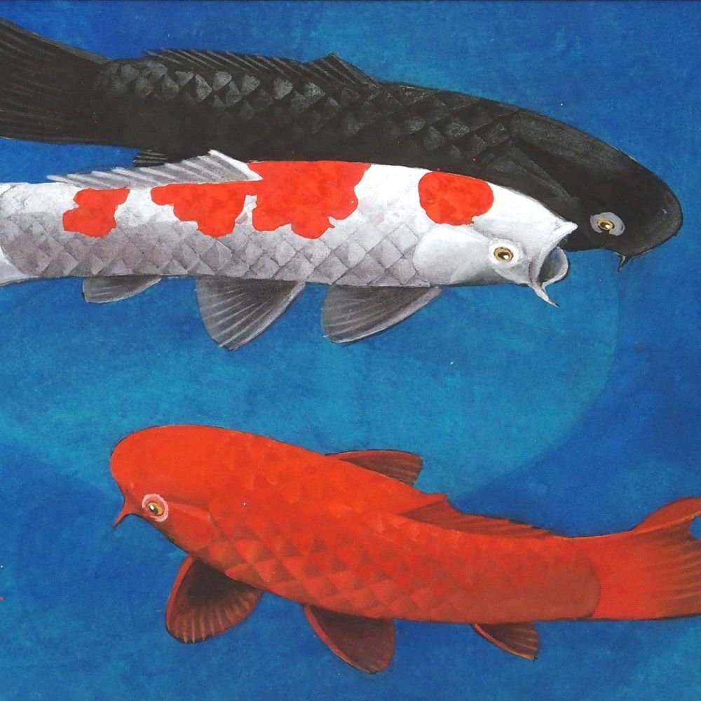 - 五十嵐晴徳「双鯉」 /紙本彩色4号/落款・共シール有り/得意とする鯉/師:奥田元宋/日展会友/真作保証/ENCHANTE