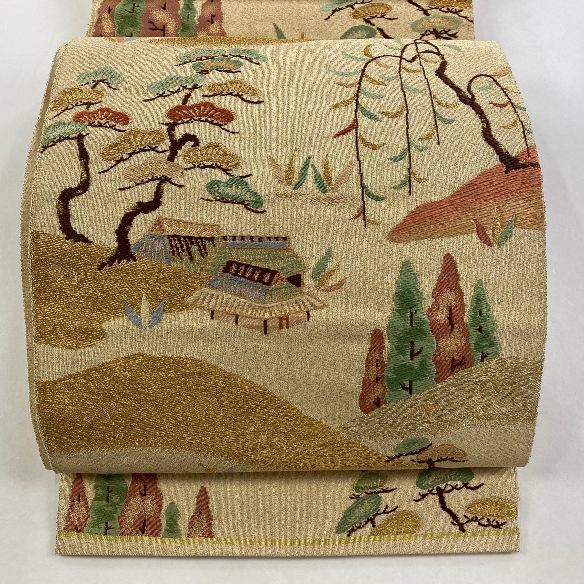 - 【美品】 袋帯 秀品 関西仕立て 家屋 樹木 金糸 唐織 ベージュ 六通 正絹 【中古】