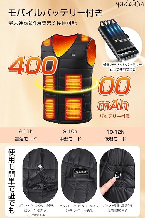 - 電熱ベスト 加熱ベスト ヒートジャケット XL ブラック 16箇所発熱 40000mAhバッテリー付き USB給電 日本製繊維 丸洗い可能 防寒対策