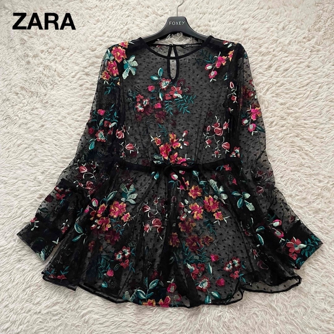 - ZARA WOMAN ザラ 花柄刺繍 チュール チュニックブラウス 黒 ブラック XSサイズ