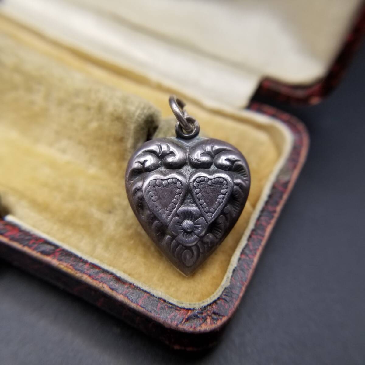 - ダブルハート 勿忘草 ヴィンテージ パフィーハート チャーム ペンダントヘッド シルバートーン レトロ キュート Y25-C
