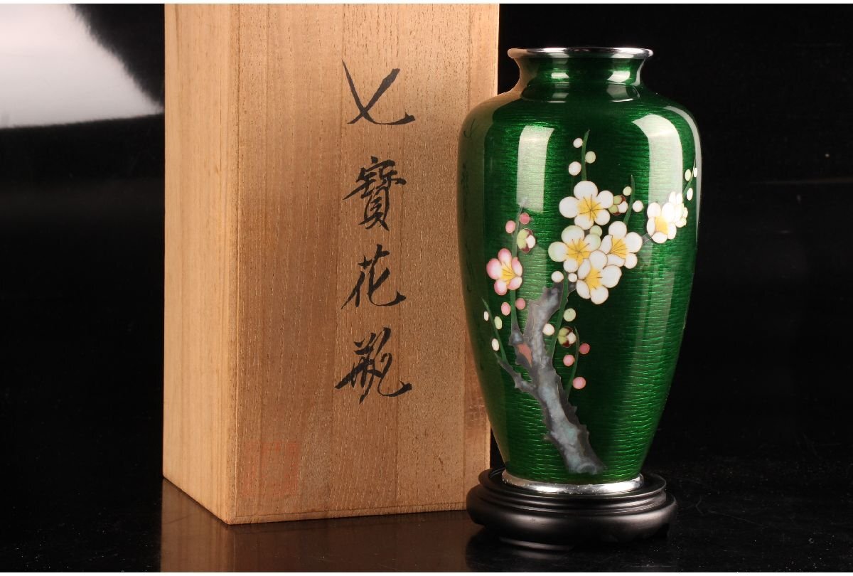 - [URA]相互七宝/緑光釉梅文七宝花瓶/H20.3cm/4-10-160 (検索)骨董/七宝焼/壷/蓋物/花瓶/花器/花生/花入/唐物/古玩
