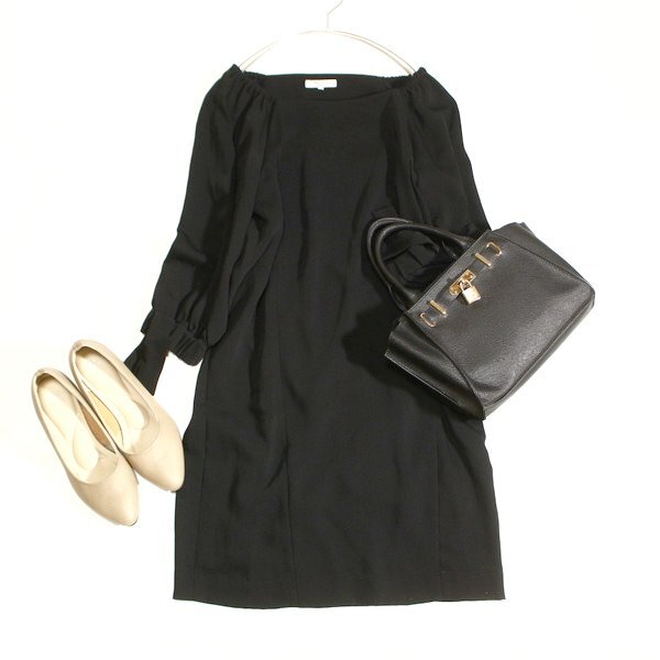 > 美品 NATURAL BEAUTY BASIC ナチュラルビューティーベーシック 大人可愛い ゴムショルダー スーツ生地 ワンピース S 春 秋 25C09