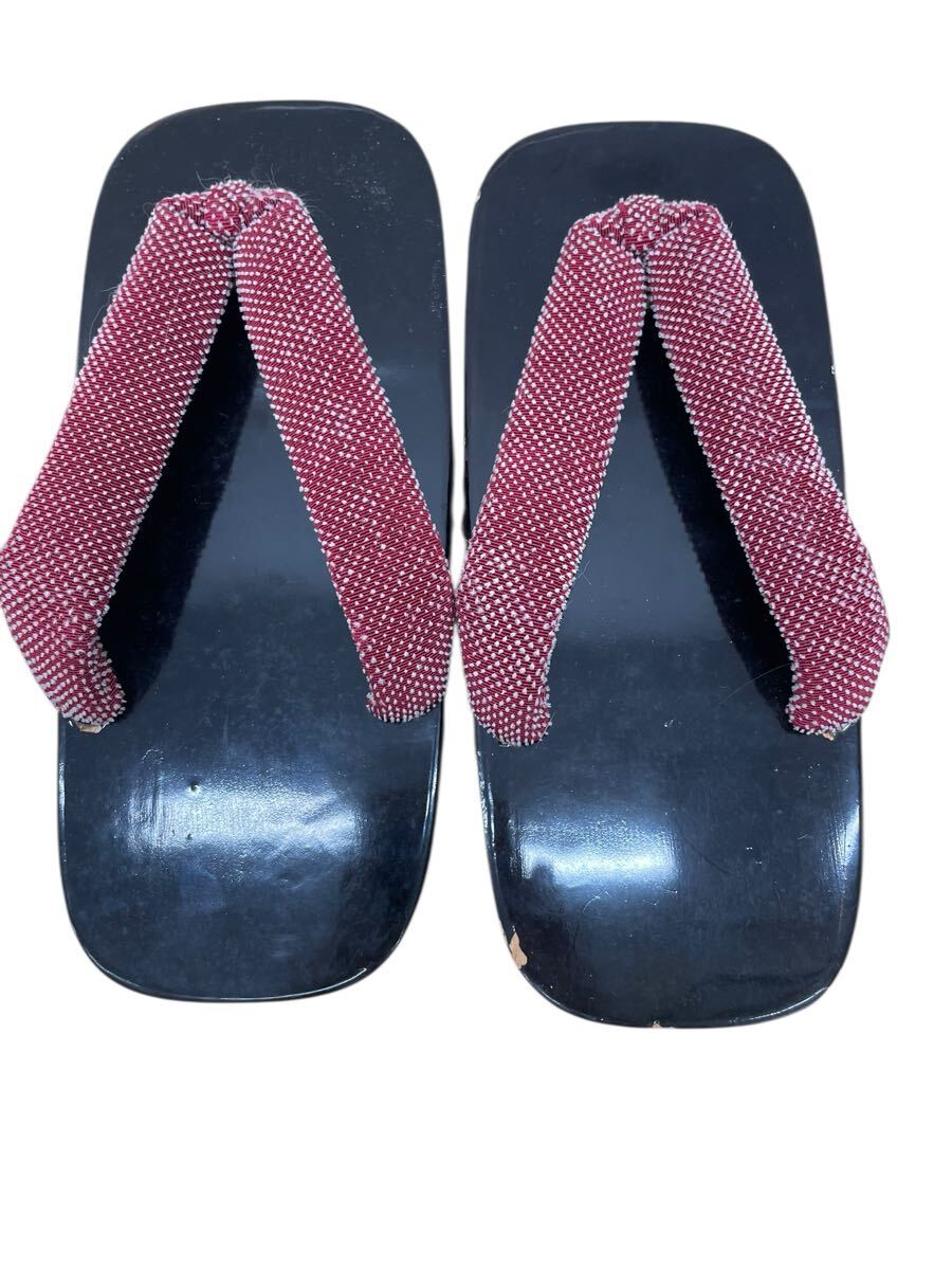 - 黒塗り 二枚歯下駄 鼻緒赤白市松柄 木製 和装履物 レトロアンティーク