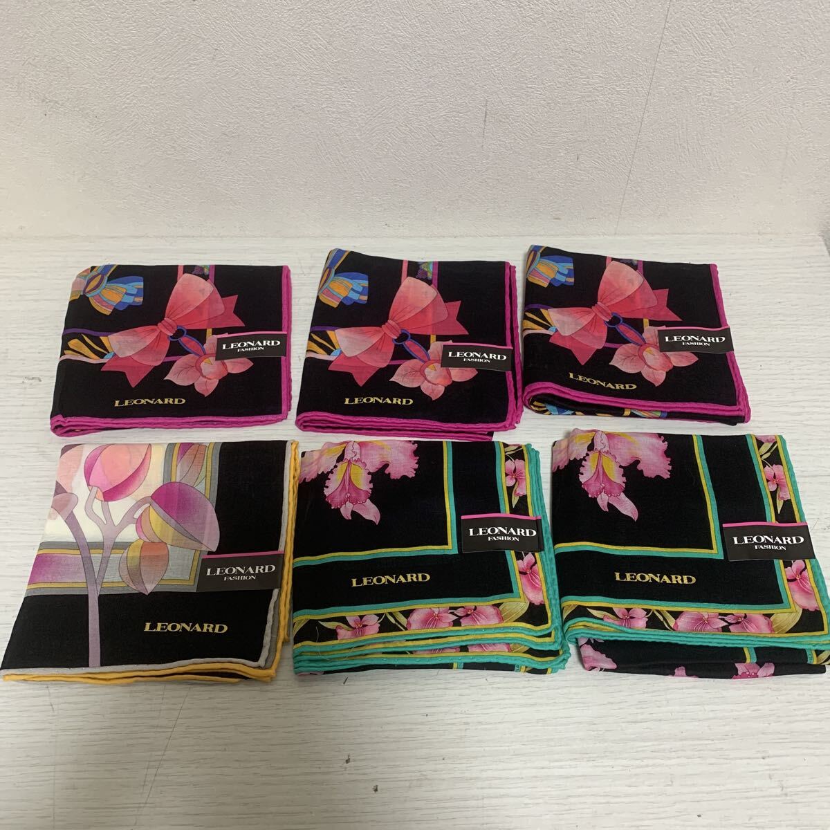 LEONARD レオナール ハンカチ 6枚セット 花柄 ピンク×3 グリーン×2 オレンジ 大判ハンカチ 箱なし