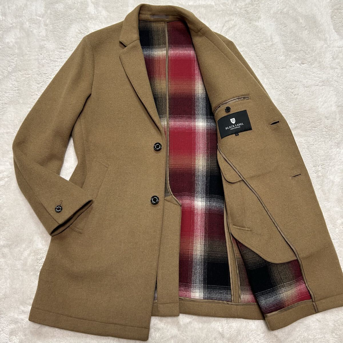 - 美品!/Lサイズ●ブラックレーベルクレストブリッジ BLACK LABEL CRESTBRIDGE チェスターコート キャメル チェック ロングコート ウール