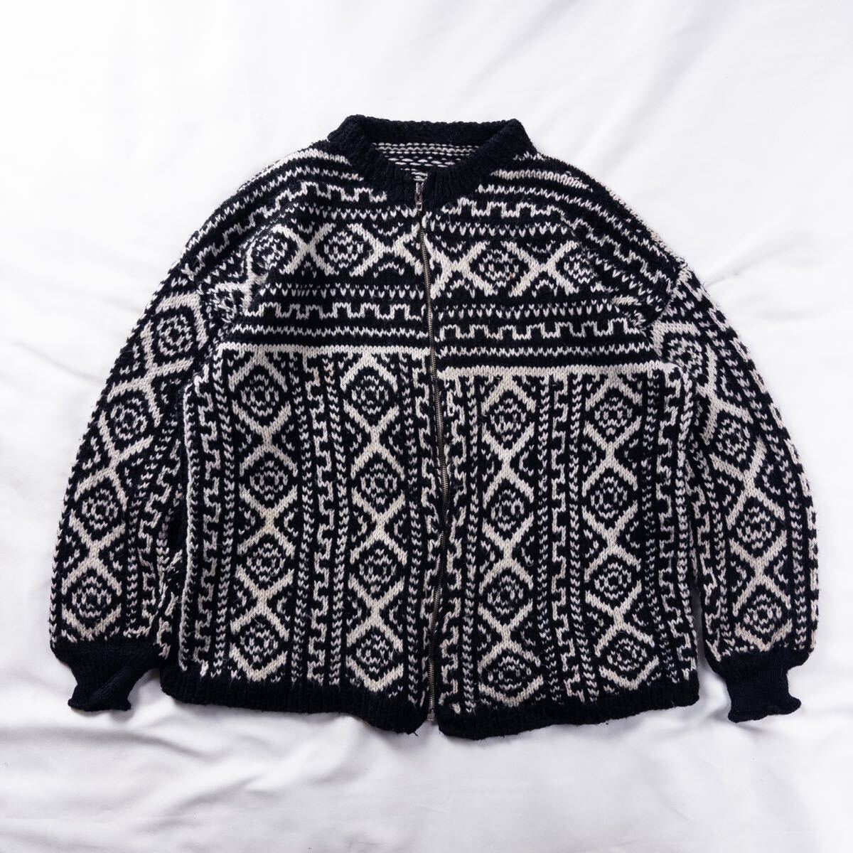 - Euro Vintage 70-80s Unknown アクリル モノトーン フェアアイル エスニック 民族 幾何学 アート PRYMジップ 短丈 総柄ニットジャケット
