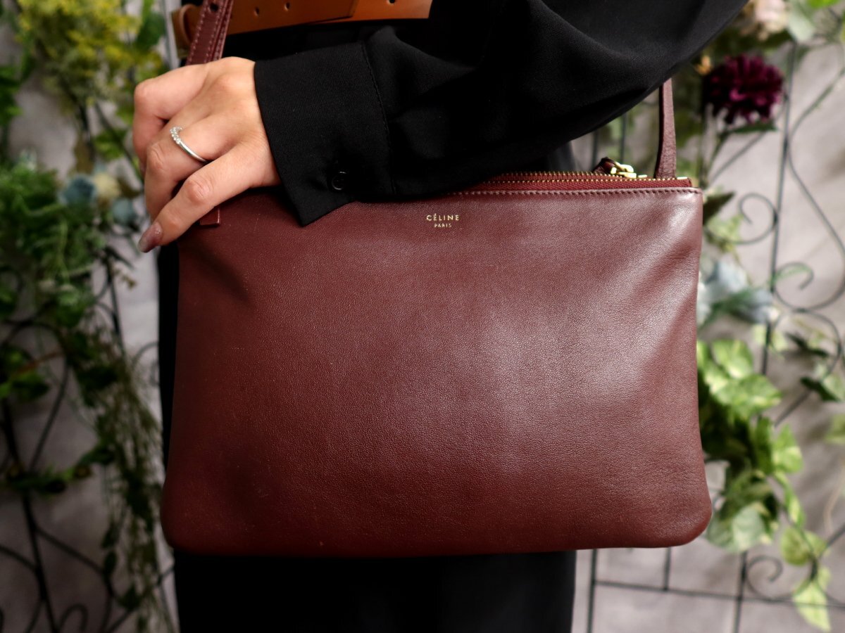 > ●超美品●CELINE セリーヌ●トリオ●カーフ レザー 本革●ショルダー バッグ●ボルドー●ゴールド金具●斜め掛け●収納 かばん●Js61594
