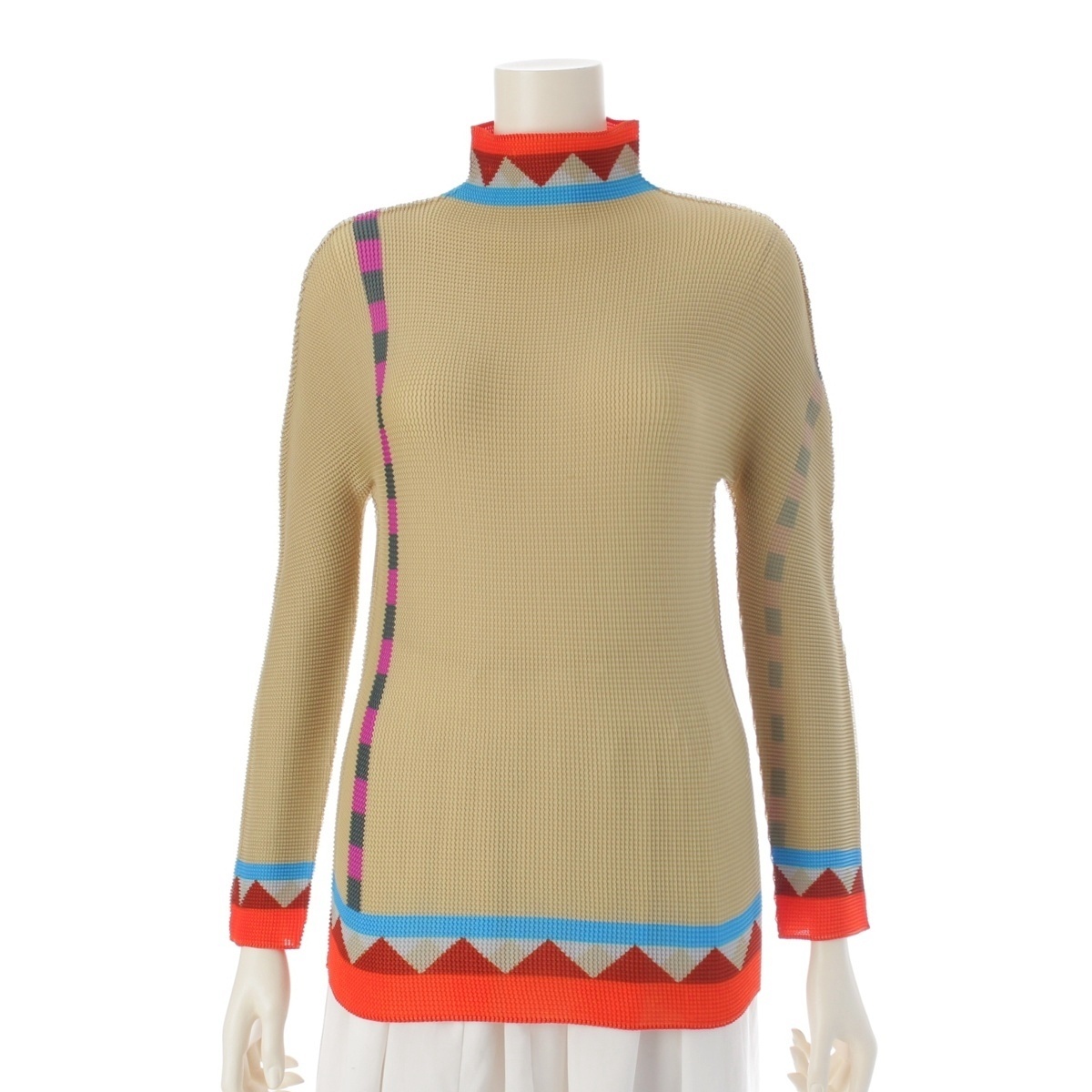 > ミー イッセイミヤケ 14SS 幾何学柄 長袖 ボトルネック プリーツ トップス MI41FJ281 ベージュ ホワイト マルチカラー 2【中古】