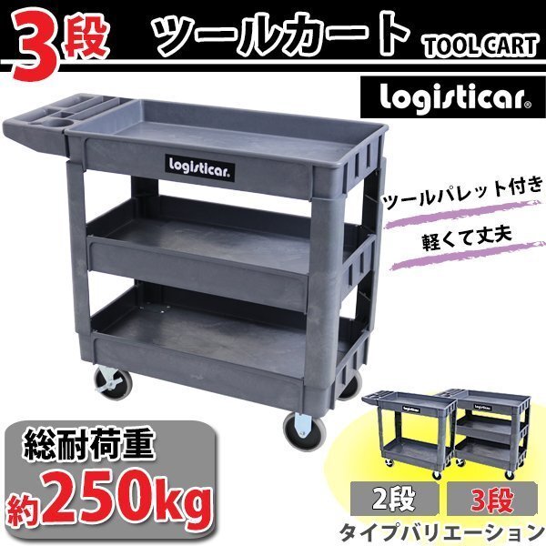 - 3段 ツールカート 樹脂製 ワゴン 総耐荷重約250kg 幅約44cm 奥行約101cm ツールパレット ツールワゴン カート 工具カート 工具棚