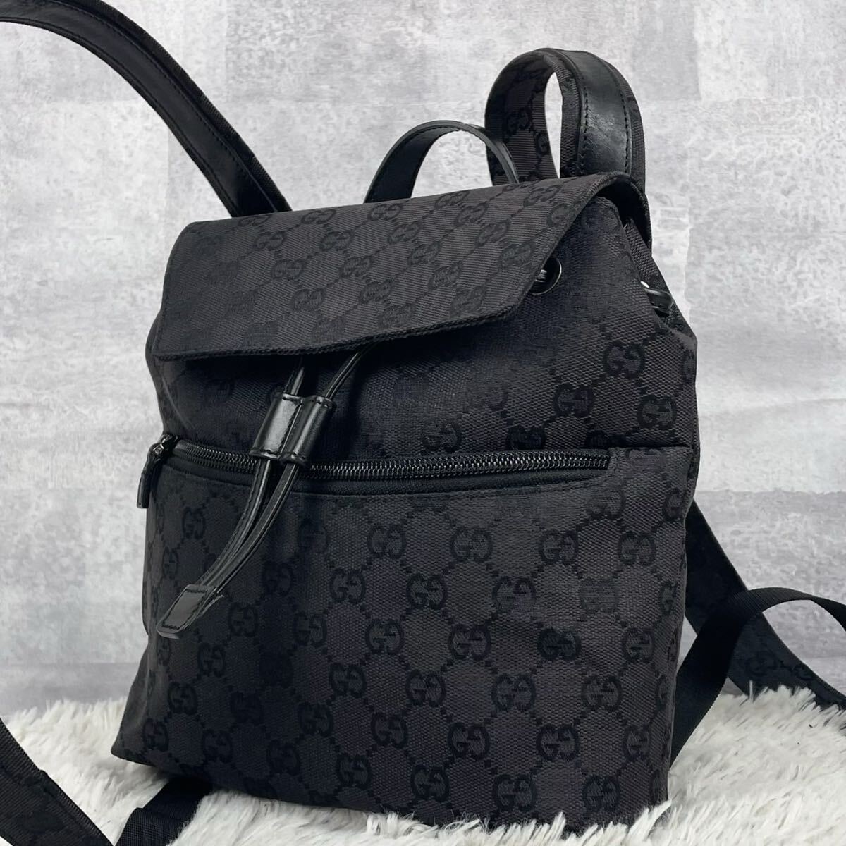 > 超希少品 GUCCI グッチ バックパック リュック ハンド 通勤 書類 メンズ キャンバス レザー フラップ ロゴ型押し ファスナー ステッチ 黒