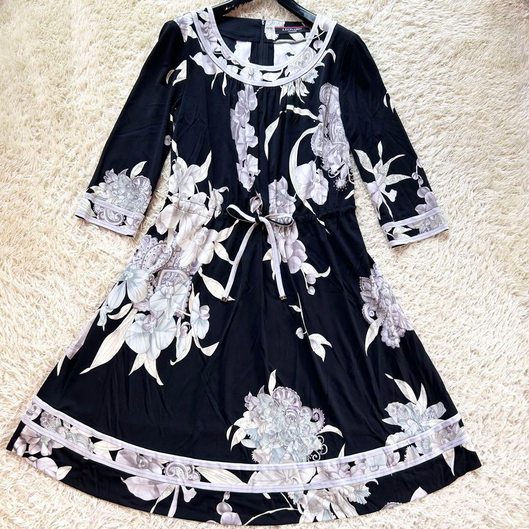 > 【未使用級LEONARD】 カンカン素材 人気柄 ベルト付きワンピース 38 リボン レオナール トリム 黒 М モノトーン 近年タグ