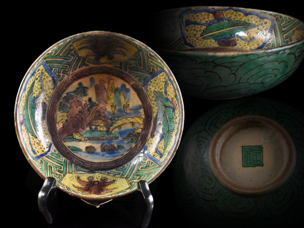 > 【雲】某有名収集家買取品 時代 古九谷 青手 楼閣山水絵付 深鉢 大鉢 福印 直径18㎝ 古美術品(飾皿 懐石料理道具 旧家蔵出)Y7156 LTUnbvc