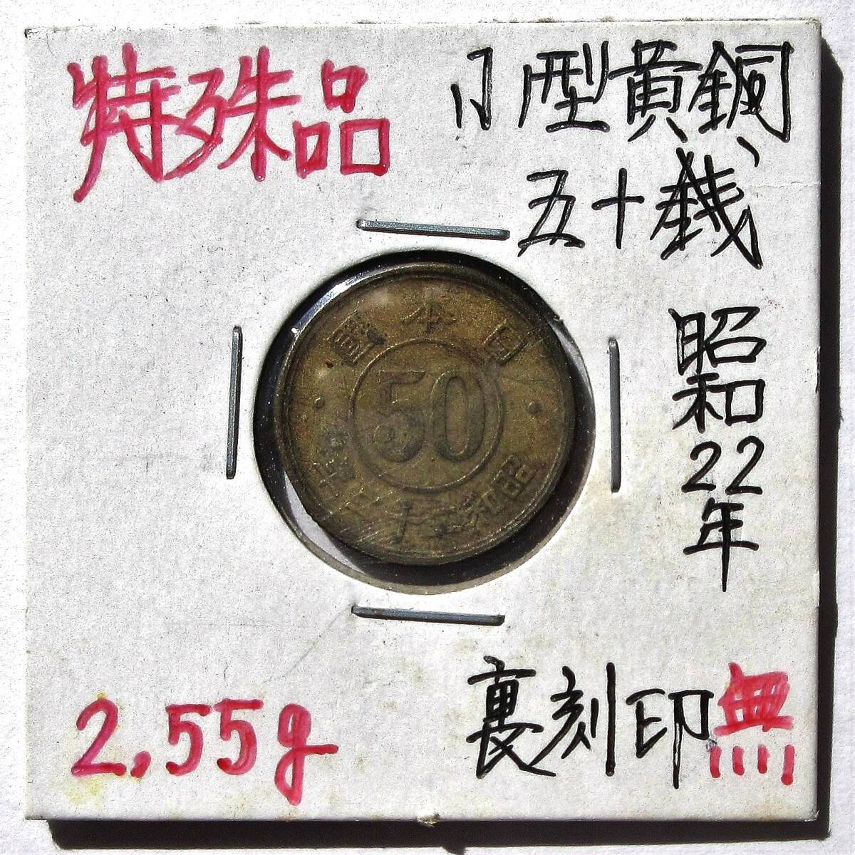 - エラーコイン 裏刻印無し 小型50銭黄銅貨 昭和22年 検索ワード/ 5円玉 穴ずれ 50円 ヘゲ 古銭