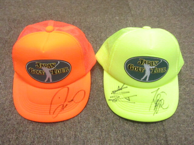> 未使用 JAPAN GOLF TOUR 選手サイン入り キャップ 2点セット 日本ゴルフ機構 ゴルフキャップ メッシュキャップ ハット 帽子 10250
