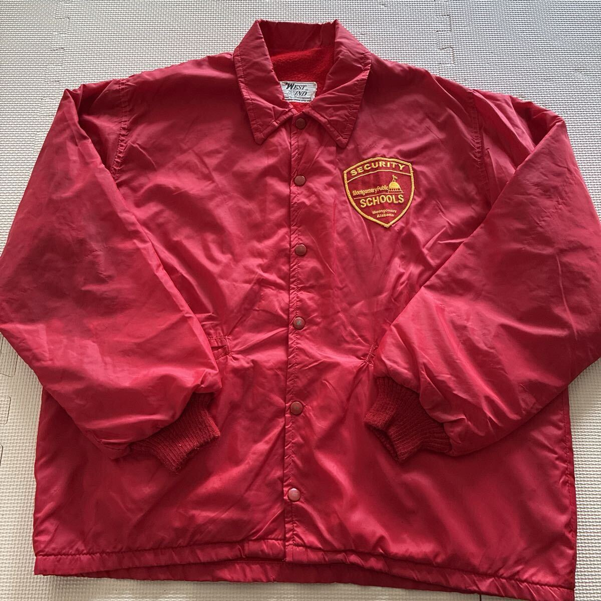 - 70s 80s【WEST WIND】ウェストウィンド スナップコーチジャケット レッド インナー有り リブ付き Lサイズ セキュリティーワッペン
