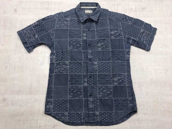 > グローバルワーク GLOBAL WORK アメカジ コロニアル ペイズリー チェック パッチワーク風 刺繍 半袖 シャンブレー シャツ メンズ L 紺