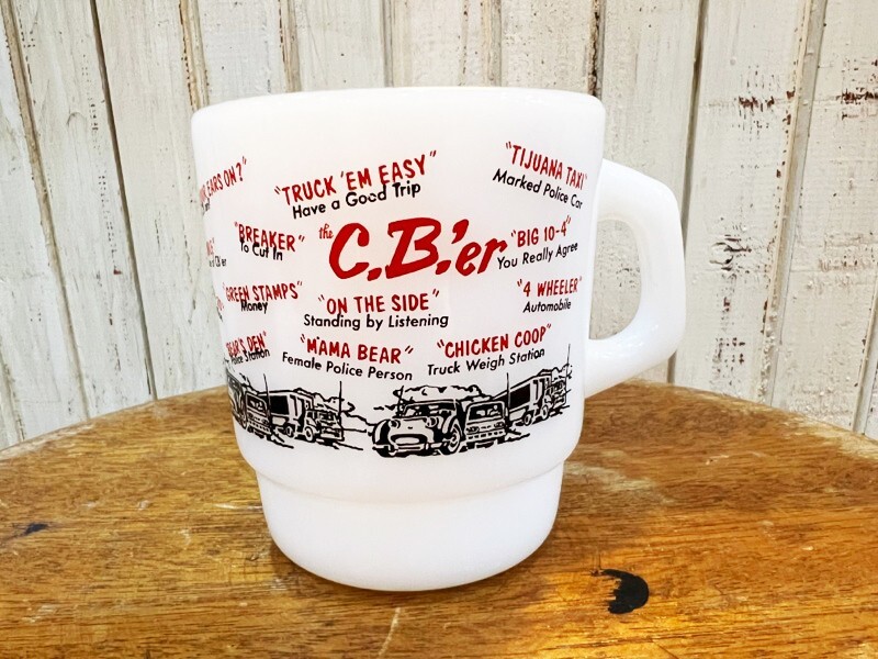 > USA製 Fire-King/ファイヤーキング C.B.'ER RED BLACK シーバー アドマグ スタッキングマグ 企業物 車 トラック 無線 USED