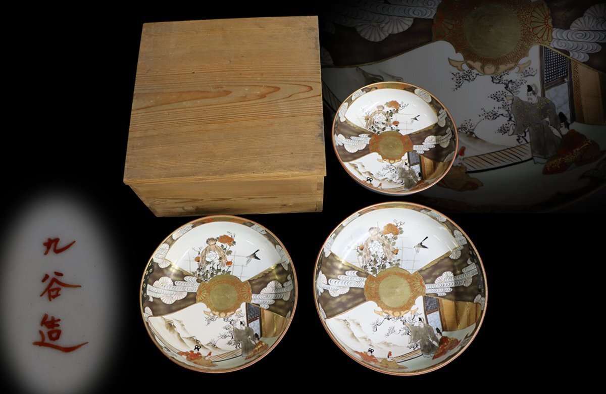 > 【江】九谷焼 金襴手花鳥人物文鉢 深皿 3客 直径30cm×9.3cm 木箱 古美術品(懐石料理道具飾皿菓子鉢)AX1394 CTDBedki