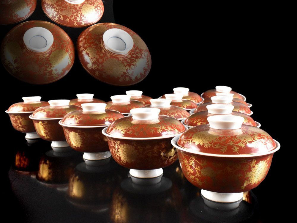 > 【雲】某有名資産家買取品 九谷 金彩 赤絵 金襴手 花唐草絵付 蓋付 茶碗 15客 古美術品(懐石料理道具 旧家蔵出)Y7188 LTUbvg