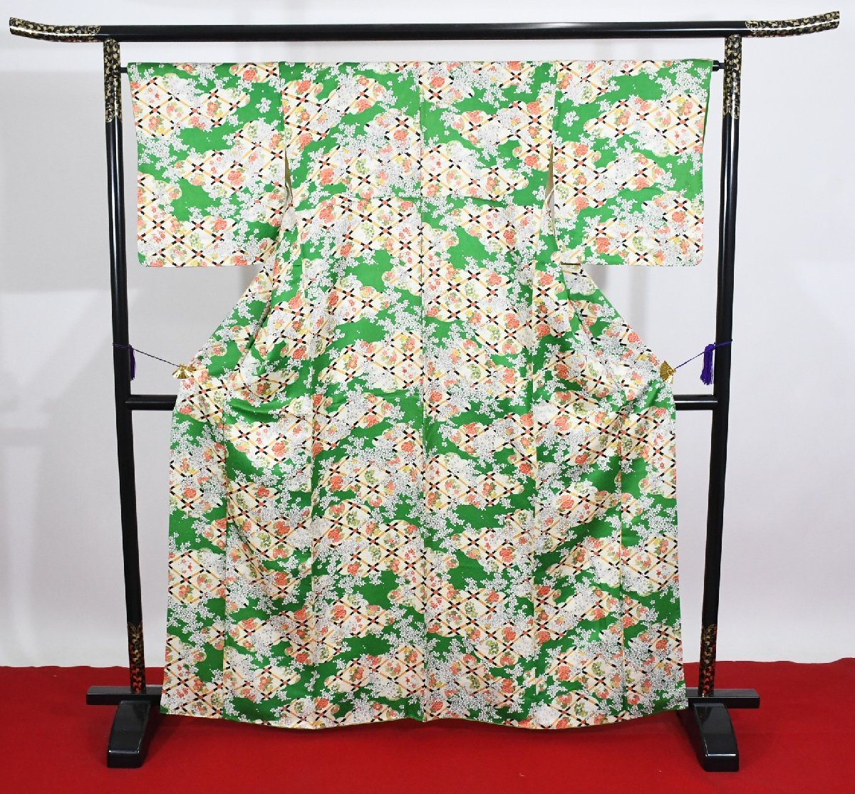 > 小紋 着物 袷 花尽くし 雲取り 緑 身丈157cm 裄丈65.5cm ★ kb-7433 桜庭呉服店
