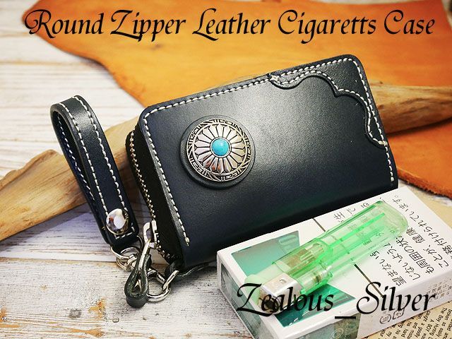 - レザータバコケース ターコイズコンチョ ラウンドファスナー キーホルダー付き ハンドメイド 牛本ヌメ革 牛本ヌメ ネイビー