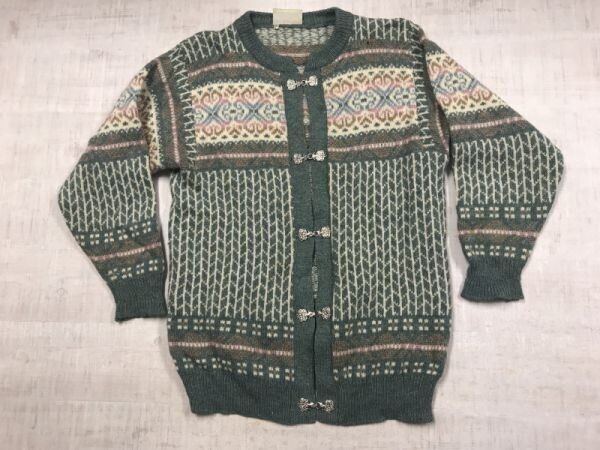 > スコットランド製 maddy moss オールド 90s カントリー古着 フックボタン ジャガード ノルディック ニット カーディガン レディース M 青系