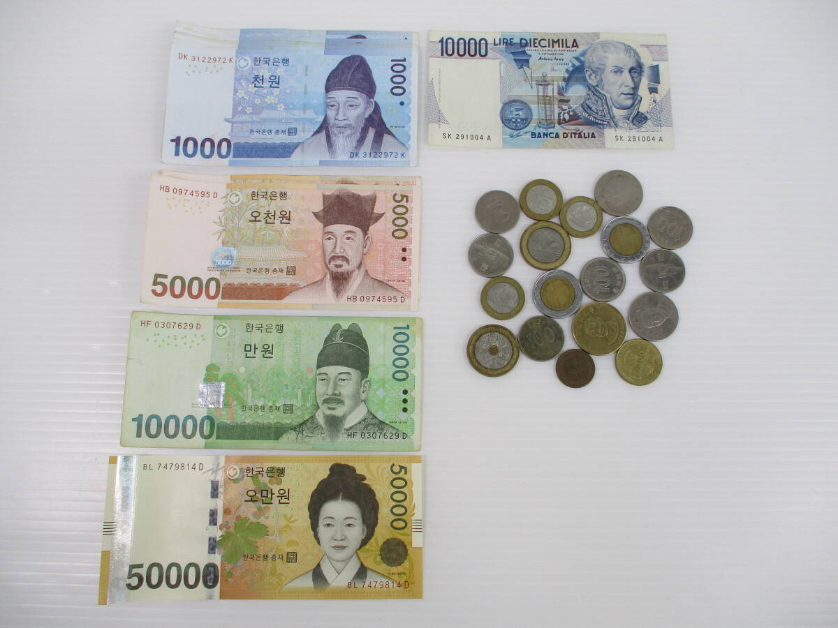 - 2510M2210 外国紙幣 韓国 計76000ウォン イタリア 10000リラ他 外国硬貨 総重量約117.1g 外貨おまとめ
