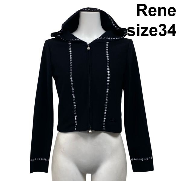 > ルネ Rene フード付きジップアップジャケット ショート丈 ニット 黒 ブラック 34 S 7号 レディース S5V453