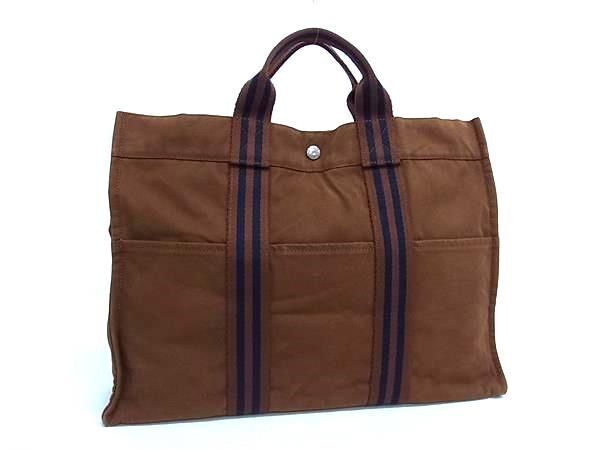 - 1円 HERMES エルメス キャンバス フールトゥMM シルバー金具 トートバッグ ハンドバッグ レディース ブラウン系×ネイビー系 DB3165