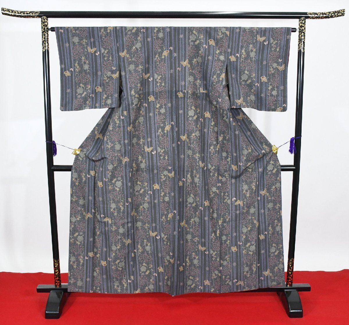 > 小紋 着物 袷 縞々 花 蝶々 身丈1525cm 裄丈63cm ★ kb-7394 桜庭呉服店