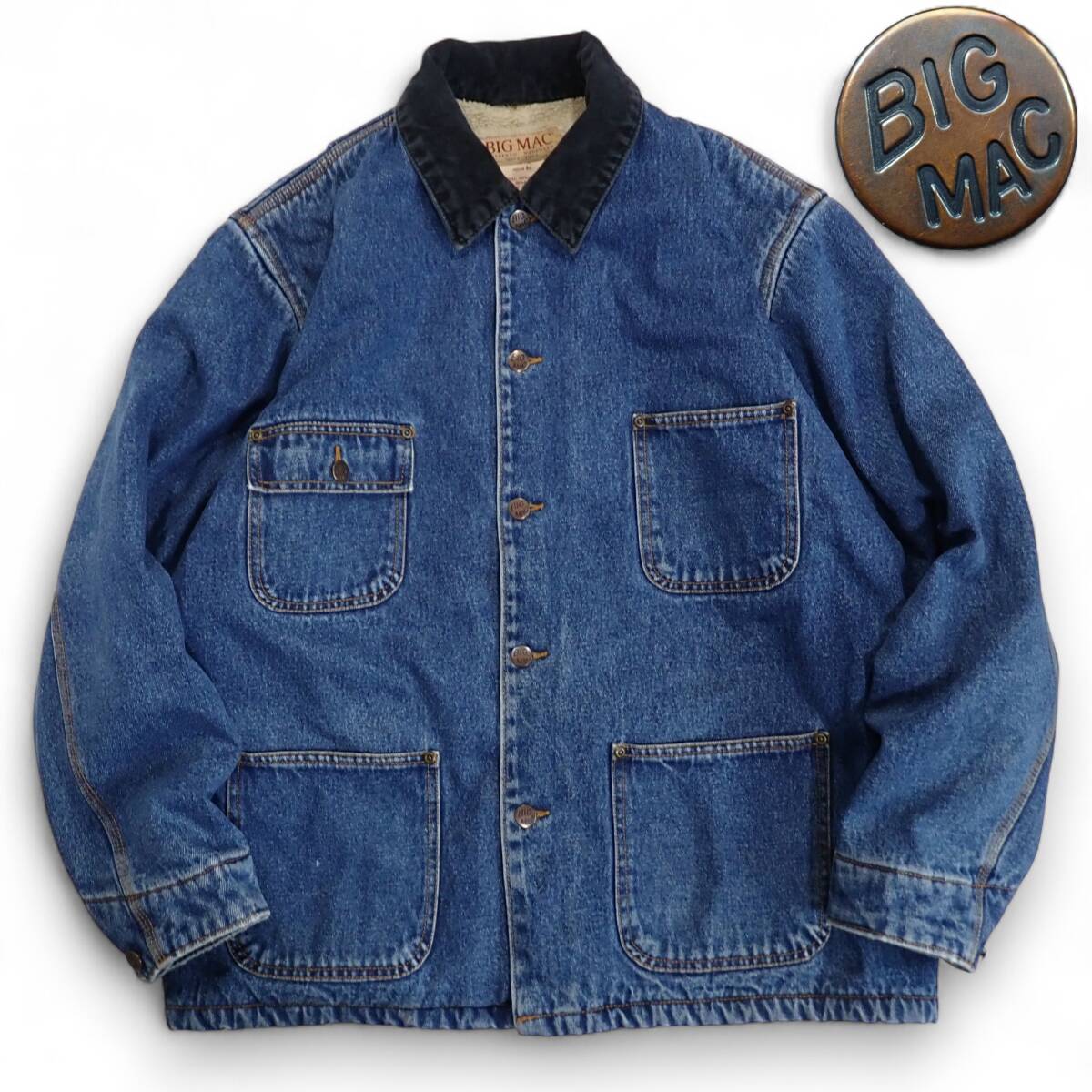 > BIG MAC 90sビンテージ デニム カバーオールジャケット M(実質L程度)●コーデュロイ襟 裏ボア 防寒 ガチャポケ●洗濯プレス済●古着7162