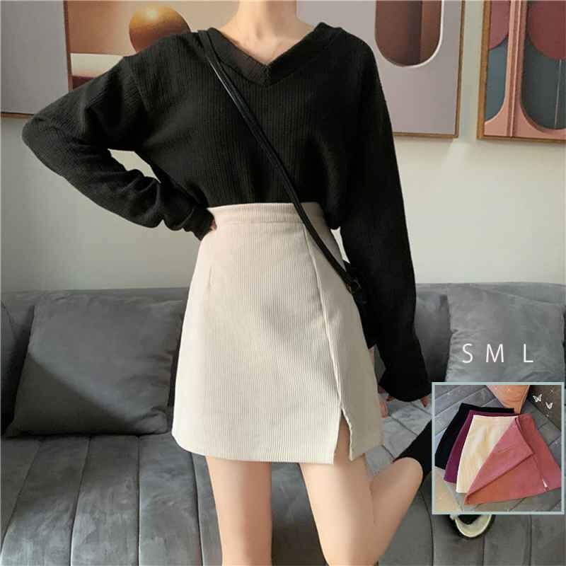 - ミニタイトスカート スリット入り Aラインスカート コーデュロイ ハイウエスト L パープル