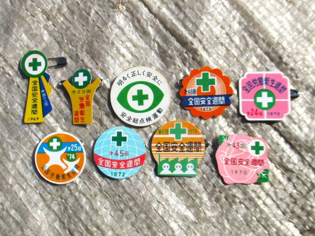 - 1960~70年代・昭和ビンテージ 大量 全国安全週間 全国労働衛生週間 安全総点検運動 バッチ 9点 緑十字 安全第一 まとめて・売切