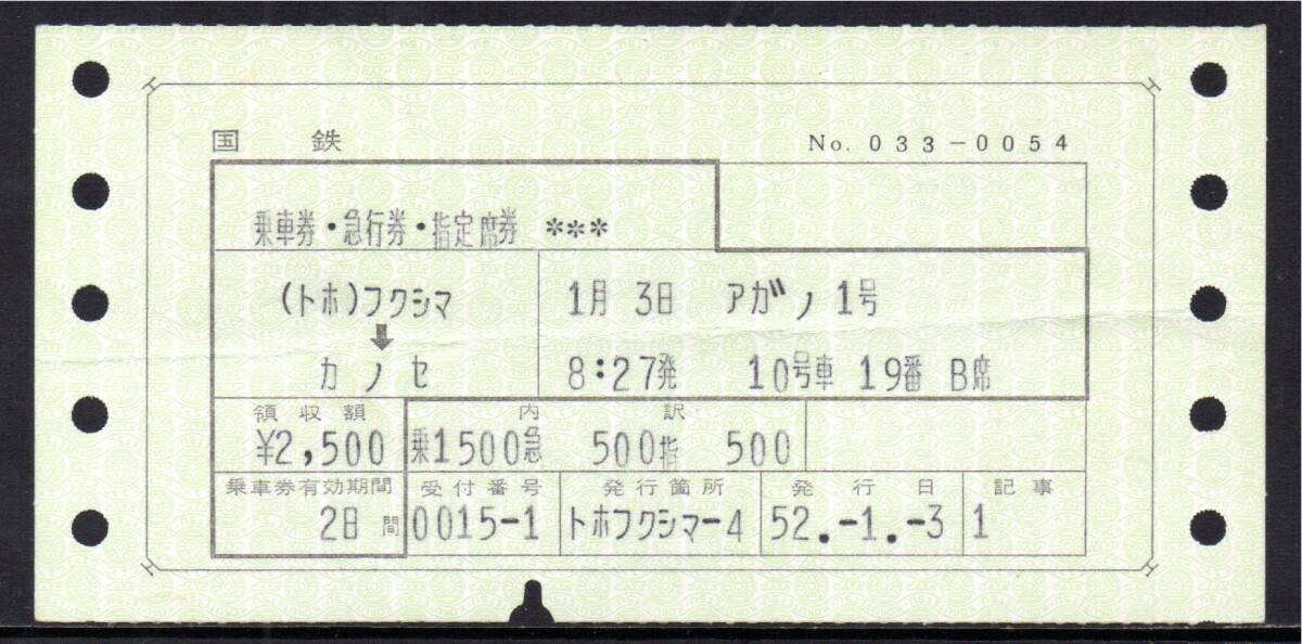 - 国鉄 マルス券 あがの1号 乗車券・急行券・指定席券 福島→鹿瀬 初期N型