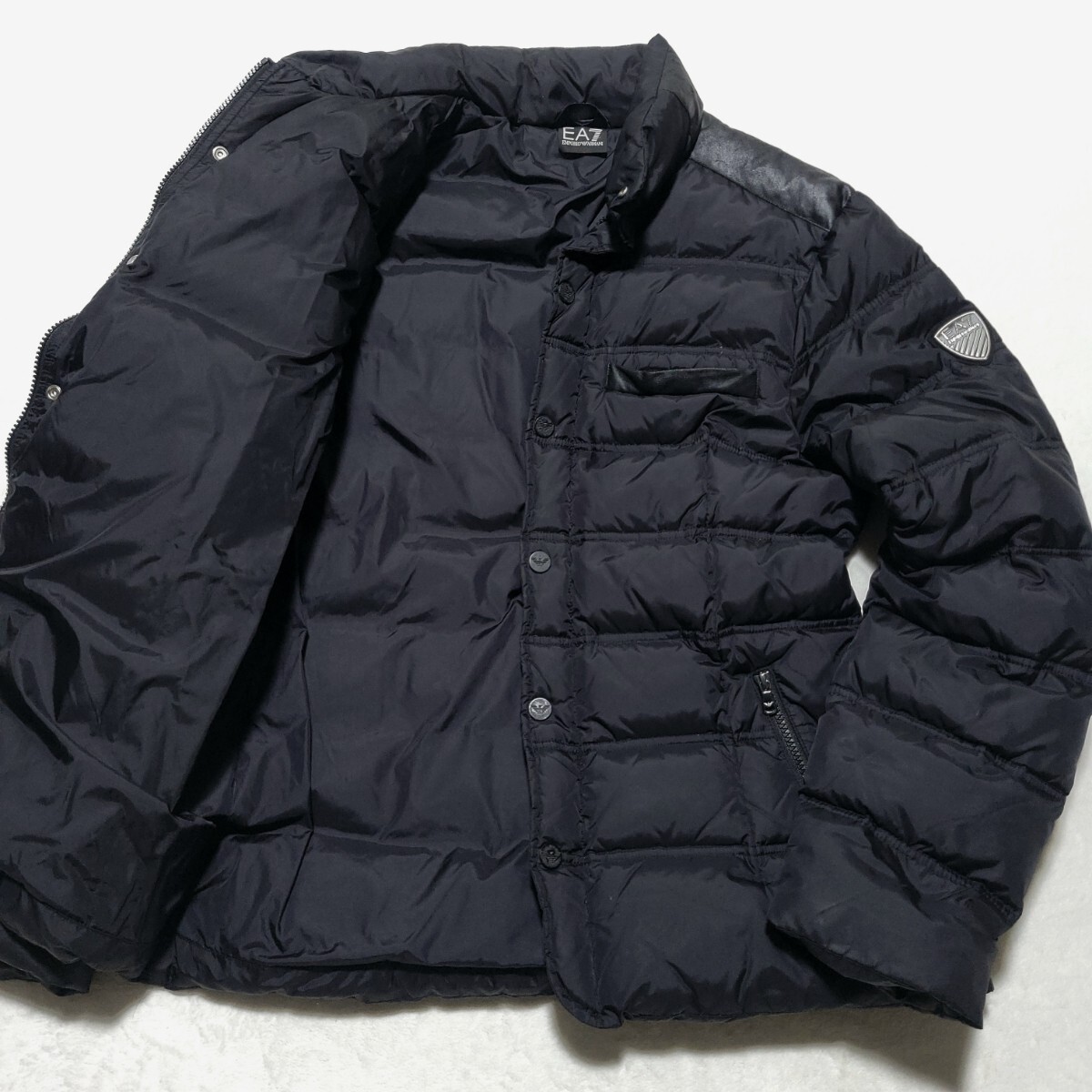 - 美品/Lサイズ ■エンポリオアルマーニ EMPORIO ARMANI ダウンジャケット ブルゾン 切り替え レザー ワッペン エンブレム 極暖 メンズ 黒