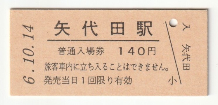 - 平成6年10月14日 信越本線 矢代田駅 140円硬券普通入場券(日付印刷)