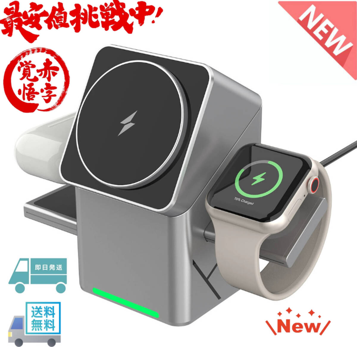 - ワイヤレス充電器 3in1 Magsafe Qi2認証 マグセーフ 回転式 マグネット急速 15Wスタンド iPhone17/16/15/14/13/12シリーズ 置くだけ充電