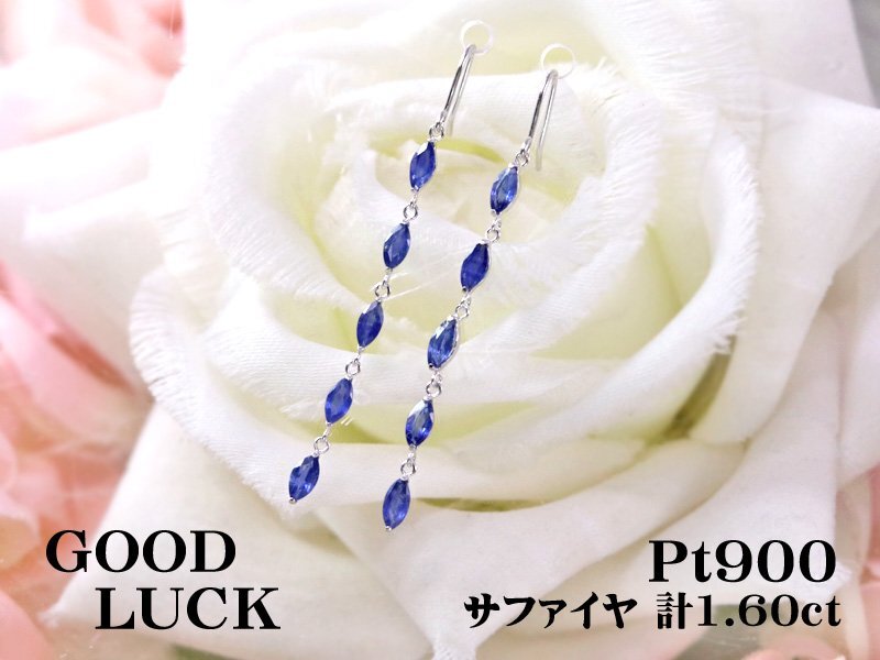 > 【新品・未使用】1円~最落無 天然サファイヤ 計1.60ct,プラチナ 揺れながら輝く マーキースカット サファイヤ 5連 フックピアス
