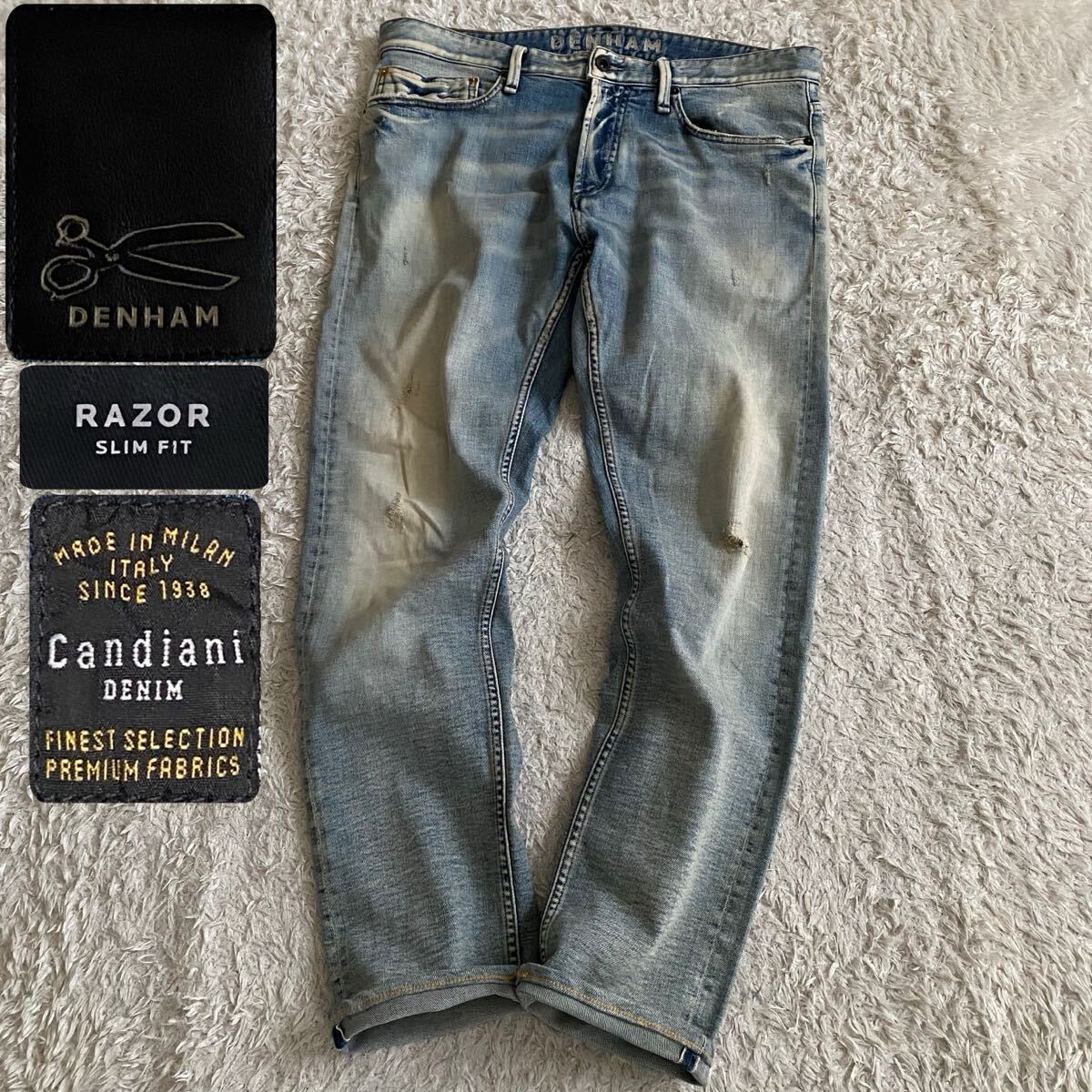 > W34 DENHAM RAZOR SLIM FIT CANDIANI デンハム カンディアーニ 赤耳セルビッジ セルビッチ ダメージ&リペア加工 USED加工 ストレッチ BL5YS