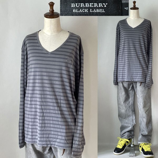 > ★【国内正規品 並品】バーバリー ブラック レーベル ホースマーク 刺繍 コットン100% Vネック ボーダー 長袖 Tシャツ サイズ4 ロンT