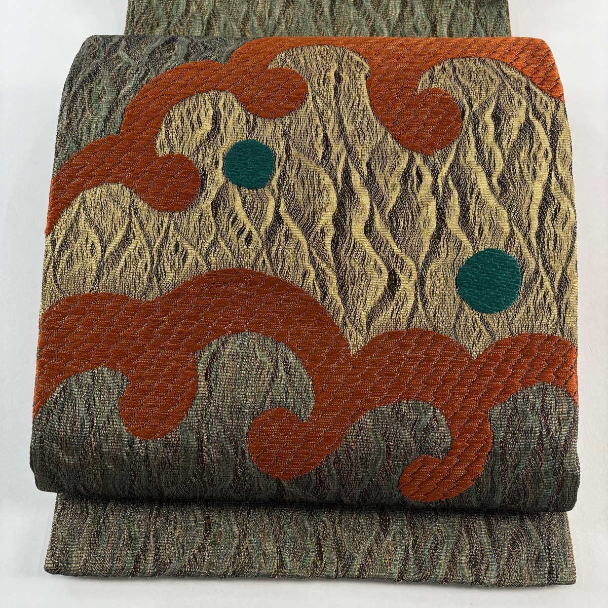 > 【美品】 袋帯 秀品 波頭 金糸 緑 お太鼓柄 正絹 【中古】