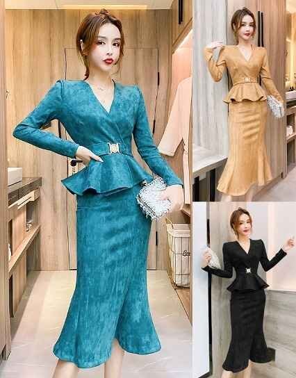 - 全3色 長袖ワンピース タイトスカート フリル 切り替え スリム 着痩せ 無地 sweet系 L グリーン
