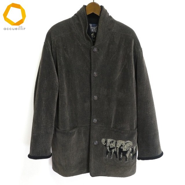 > #w イタリヤ 伊太利屋 GK ITALIYA コート フリー グレー系 ウール 毛 象プリント ゾウ柄 ロゴボタン [972601] k01