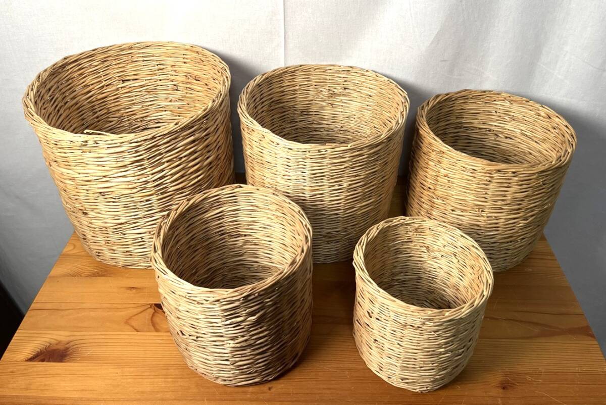 > 【S344】ラタン/籐/ラウンド型/バスケット/5個セット/多目的/カゴ/籠/ふち付き/鉢カバー/プランターカバー/ランドリーバスケット
